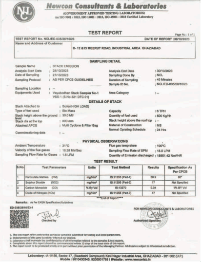 38.9 mg/Nm³ (Compliant with CPCB limit of 80 mg/Nm³).